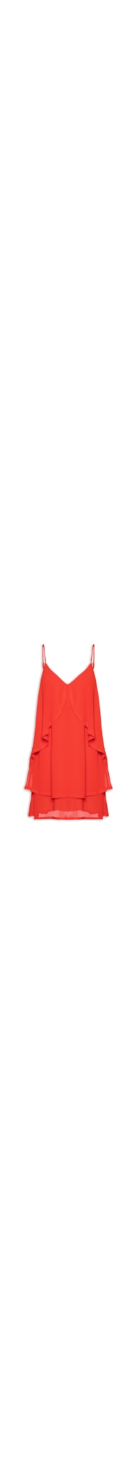 O vestido vermelho é confeccionado em crepe georgette sem elasticidade. A peça solta ao corpo possui decote V, alças finas, cavas regulares, tecidos sobrepostos a parte frontal e posterior para efeito de babados, forro e comprimento curto.