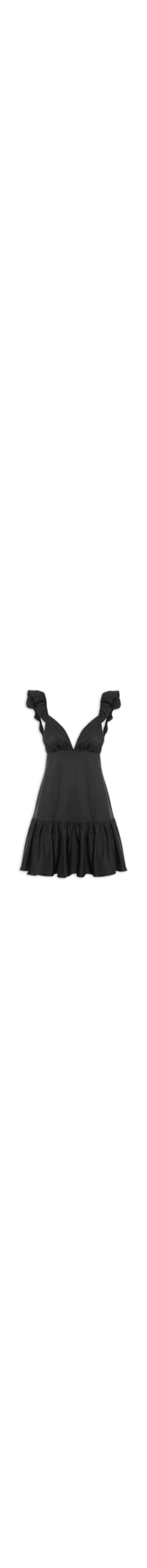 O vestido preto é confeccionado em tecido leve sem elasticidade. A peça justa na altura do busto e solta no comprimento possui decote frontal V e posterior em U, alças largas em babado, tiras finas alongadas para amarração posterior, detalhe de franzido na altura do busto, recorte na altura da barra com babado, forro, sem bojo, tag metalizada da marca aplicada na parte posterior, comprimento curto e fechamento posterior por zíper invisível.