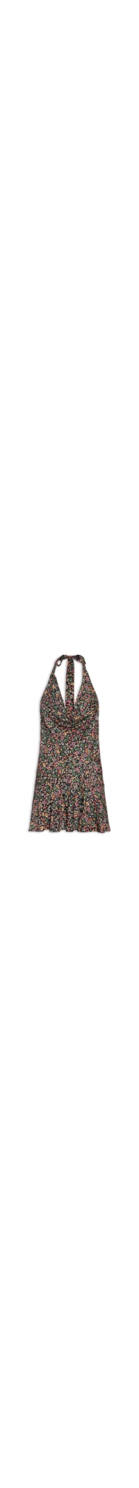 O vestido preto é confeccionado em tecido leve com baixa elasticidade. A peça possui decote degagê, alças finas alongadas, cavas alongadas, decote posterior profundo em U, recorte na altura da barra com efeito de babado, estampa figurativa em cores contrastantes, comprimento curto e fechamento posterior por amarração.