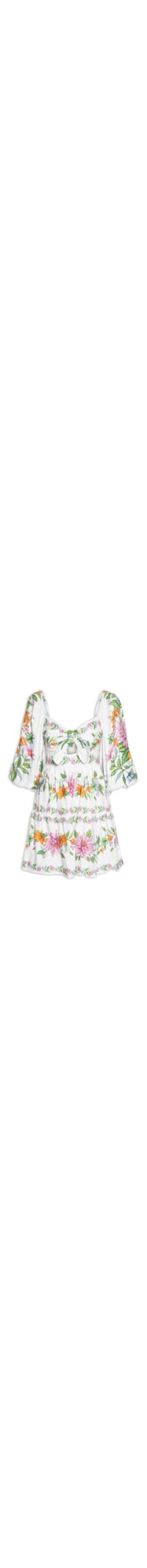O vestido off white é confeccionado em tecido leve sem elasticidade. A peça solta ao corpo, possui decote princesa, mangas longas com elástico embutido nos ombros e punho, recorte vazado na parte frontal do busto com detalhe de nó, saia em camadas com detalhes franzidos, lastex aplicado na parte posterior, estampa floral em cores contrastantes, comprimento curto e forro superior.