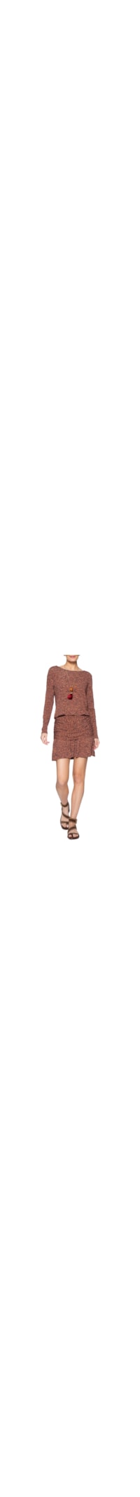 O vestido marrom é confeccionado em malha leve com baixa elasticidade. A peça possui decote canoa, mangas longas, estampa geométrica em tons contrastantes, modelagem ajustada ao corpo, detalhe de franzido na região da cintura e quadril, comprimento curto com barra levemente rodada e caimento confortável.
