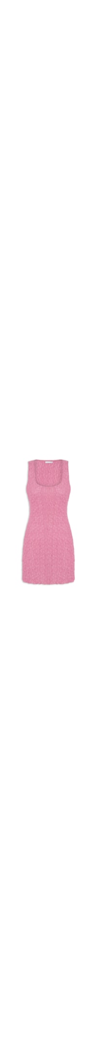 O vestido rosa é confeccionado em tecido leve com acabamento texturizado e baixa elasticidade. A peça justa ao corpo possui decote em U, alças médias, cavas regulares e comprimento curto.