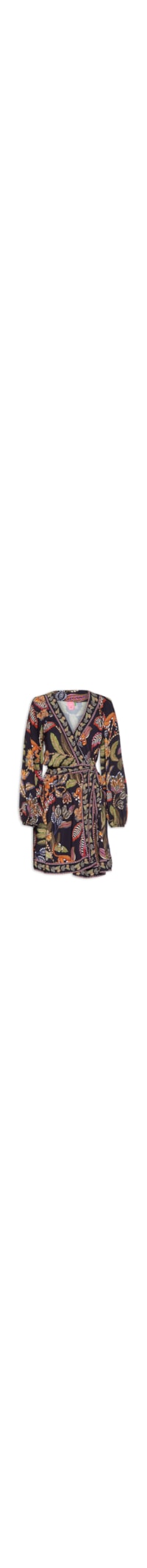O vestido preto é confeccionado em tecido leve sem elasticidade. A peça solta ao corpo possui decote V, mangas longas com elástico embutido na barra, lastex aplicado na parte posterior, mix de estampas em cores contrastantes, comprimento curto e fechamento frontal por tiras alongadas para ajuste e amarração.