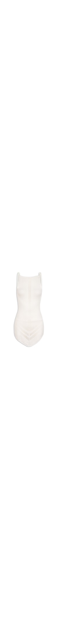O vestido branco é confeccionado em tricot vazado com média elasticidade. A peça justa ao corpo possui decote redondo, alças médias, ombros à mostra e caimento ajustado ao busto e ao comprimento, com trama trabalhada em pontos vazados formando desenho geométrico ao longo da peça, recorte posterior profundo com costas abertas e barra curta com acabamento em tricot.