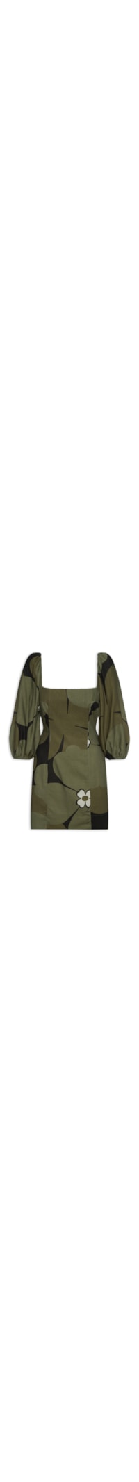 O vestido verde é confeccionado em tecido leve com toque de linho sem elasticidade. A peça justa ao corpo possui decote quadrado, mangas 3/4 com elástico embutido na barra, recortes frontais, recorte posterior vazado com tiras alongadas para amarração, mix de estampas em cores contrastantes, comprimento curto e fechamento posterior por zíper invisível.