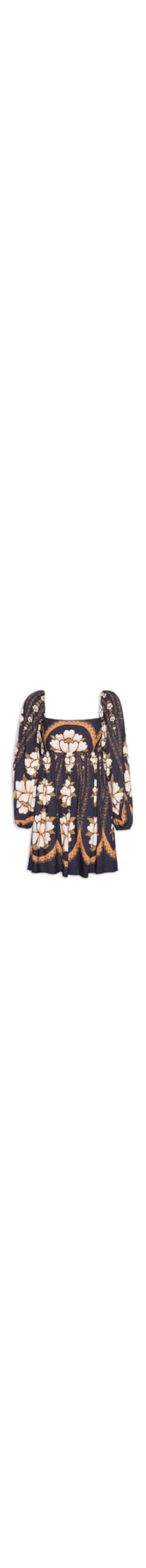 O vestido preto é confeccionado em tecido leve sem elasticidade. A peça justa no busto e solta no corpo possui decote quadrado, mangas longas bufantes com elástico embutido nas cavas e punhos, parte posterior com lastex embutido, estampa floral em cores contrastantes e comprimento curto.