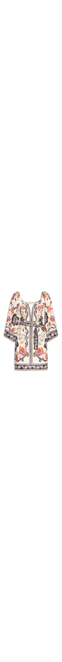 O vestido vermelho é confeccionado em tecido leve sem elasticidade. A peça solta ao corpo possui decote redondo com recorte em V vazado frontal e posterior, mangas 7/8 amplas, padronagem floral e comprimento curto. Acompanha cordão em mesmo tecido e estampa para amarração opcional.