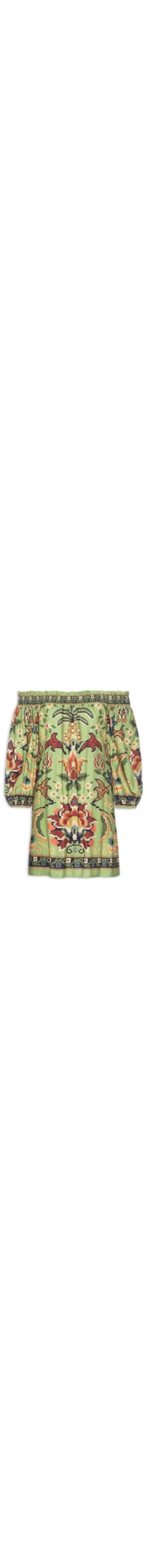 O vestido verde é confeccionado em tecido leve sem elasticidade. A peça solta ao corpo possui decote ombro à ombro com lastex aplicado, mangas 7/8 bufantes com elástico nos punhos, comprimento curto e mix de estampas em cores contrastantes.