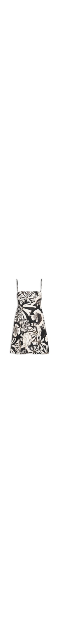 O vestido preto é confeccionado em tecido leve sem elasticidade. A peça justa na altura do busto e solta no comprimento possui decote reto, alças médias com regulagem, recorte posterior em lastex, sem bojo, pences na altura do busto, recortes posteriores e frontais, mix de estampas florais e comprimento curto.