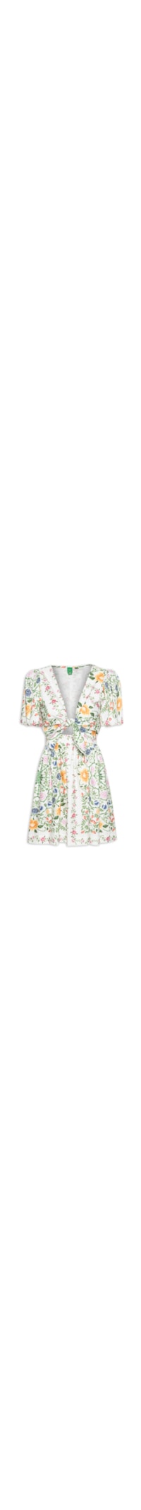 O vestido verde é confeccionado em tecido leve sem elasticidade. A peça solta ao corpo possui decote V profundo com tiras alongadas para amarração, mangas curtas com efeito franzido, recorte na altura da cintura com elástico embutido na parte posterior, mix de estampas em cores contrastantes e comprimento curto.