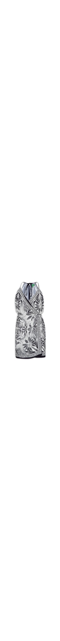 O vestido preto é confeccionado em tecido leve sem elasticidade. A peça solta ao corpo, possui decote em V com detalhe transpassado frontal, alças finas com regulagem, detalhe sobreposto na parte frontal da saia, faixas aplicadas na parte frontal para amarração na lateral da cintura, recorte vazado na parte posterior, elástico embutido na parte posterior da cintura, mix de estampas figurativas em cor contrastante, comprimento curto e fechamento posterior por botão.