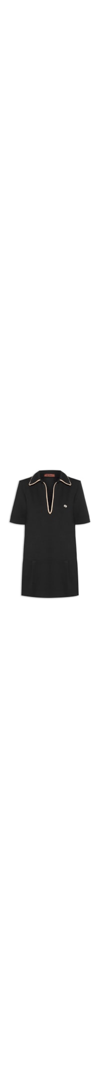 O vestido preto é confeccionado em malha de média elasticidade. A peça solta ao corpo possui gola esporte, decote V, mangas curtas, logo da marca bordado na altura do busto na cor bege, recorte no comprimento com detalhe de pregas, acabamento superior com viés na cor bege e comprimento curto.