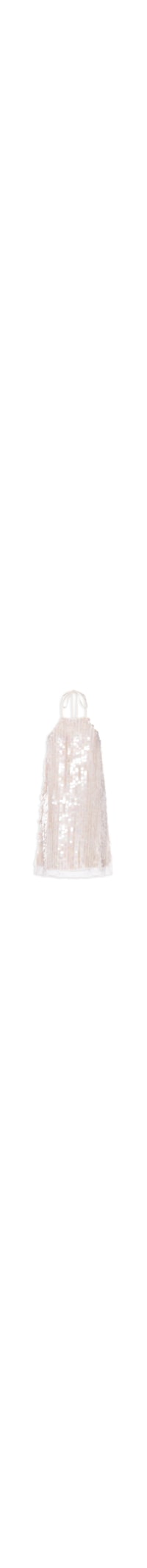 O vestido bege é confeccionado em tecido leve com superfície em paetês. A peça solta ao corpo possui decote halter, alças finas alongadas para amarração posterior, recorte na altura da barra com transparência, forro e comprimento curto.