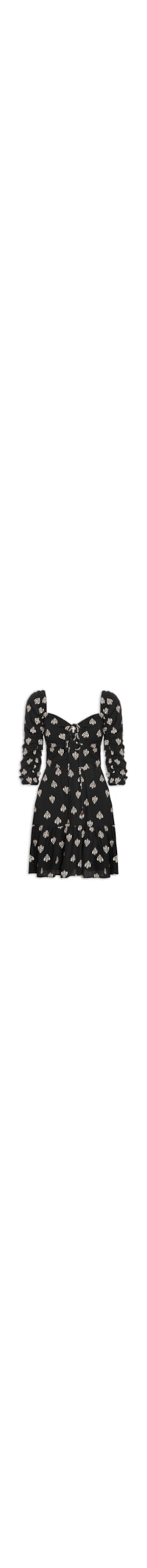 O vestido preto é confeccionado em tecido leve sem elasticidade. A peça justa na altura do busto e da cintura e solta no comprimento possui decote frontal V e posterior quadrado, mangas curtas bufantes com elástico embutido na altura dos ombros e detalhe de franzido, recorte na altura da cintura, recorte na altura do busto com detalhe vazado e cordões alongados para amarração, sem bojo, recorte na saia com franzido, padronagem bordada em cor contrastante, forro, comprimento curto e fechamento posterior por zíper invisível.