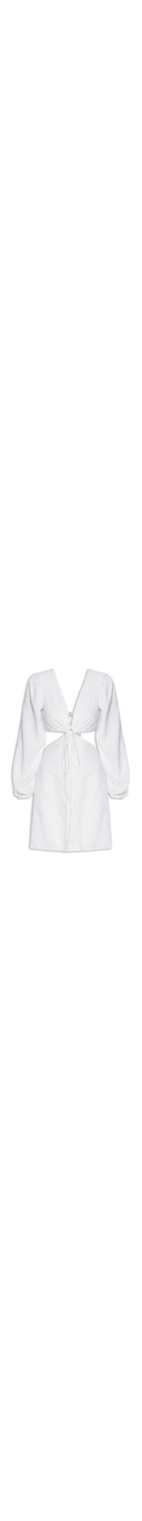 O vestido off white é confeccionado em laise. A peça possui decote V, mangas longas com elástico embutido nos punhos, recortes frontais e posteriores vazados, recorte vazado com cordão embutido para ajuste na parte frontal, elástico embutido na altura da cintura na parte posterior, shape solto, comprimento curto, caimento reto, acabamento pespontado e fechamento posterior por amarração.