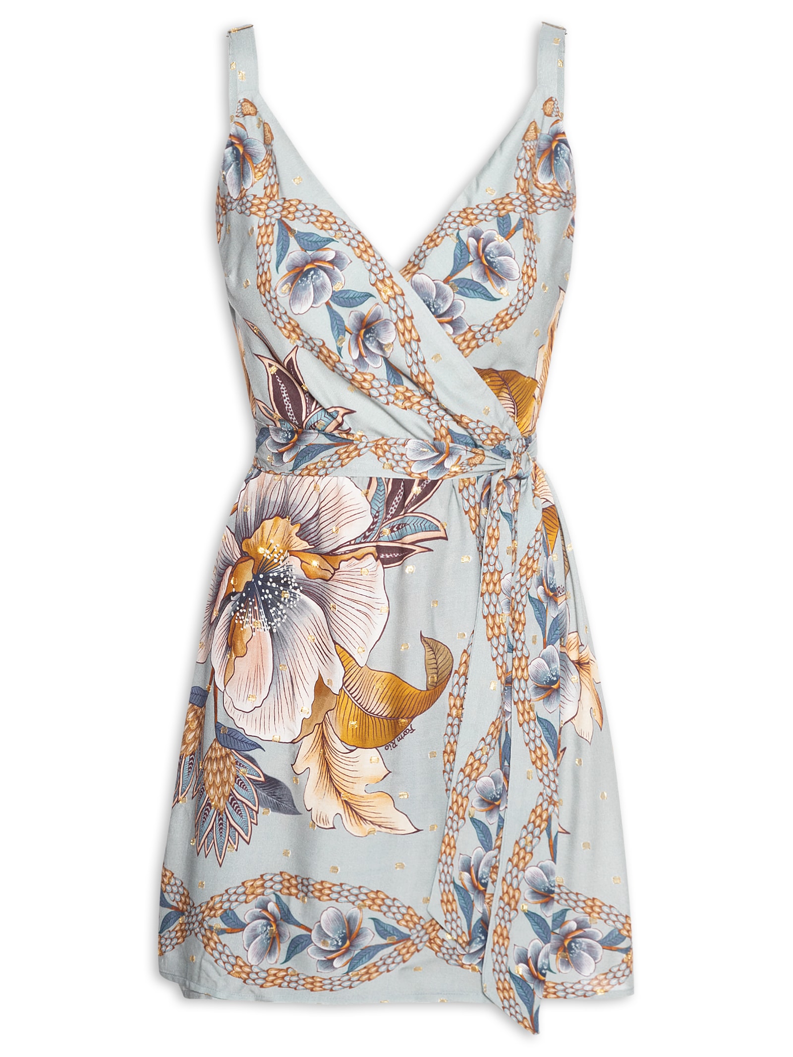 O vestido azul é confeccionado em tecido leve sem elasticidade. A peça solta ao corpo possui decote V transpassado, alças finas ajustáveis, elástico embutido na altura da cintura com faixa aplicada para amarração, comprimento curto, estampa floral em cor contrastante e detalhe com aplicação de fios de lurex, e acabamento pespontado.