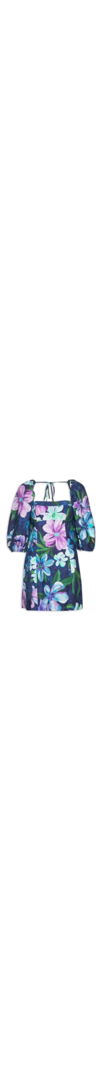 O vestido azul é confeccionado em tecido leve sem elasticidade. A peça solta ao corpo possui decote princesa, mangas bufantes 3/4 com elástico embutido na barra, recortes frontais e posteriores, lastex aplicado na parte posterior, forro superior, barra estendida, estampa floral em cores contrastantes e comprimento curto.