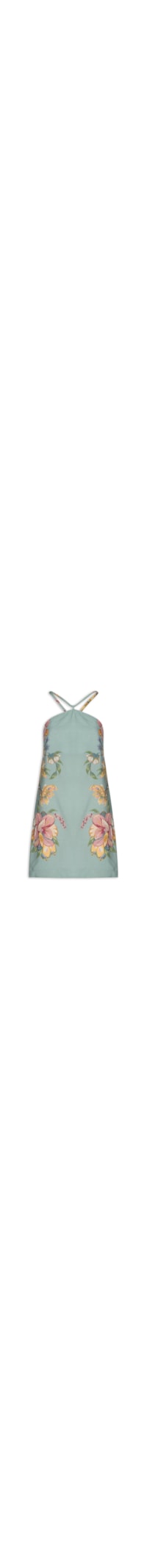 O vestido azul é confeccionado em tecido leve sem elasticidade. A peça solta ao corpo possui decote trapézio, alças finas com regulagem por amarração na parte posterior, elástico embutido na parte posterior, estampa figurativa floral em cores contrastantes e comprimento curto.