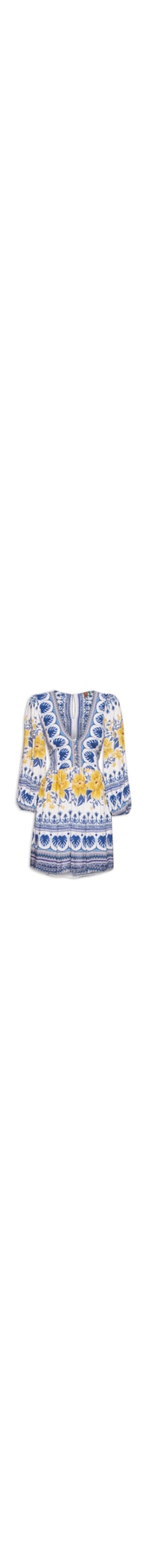 O vestido azul é confeccionado em tecido leve sem elasticidade. A peça solta ao corpo possui decote V, mangas 3/4 bufantes, recorte posterior vazado com botão aplicado, mix de estampas em cores contrastantes, recorte com detalhe de franzido, comprimento curto e fechamento frontal por botões.