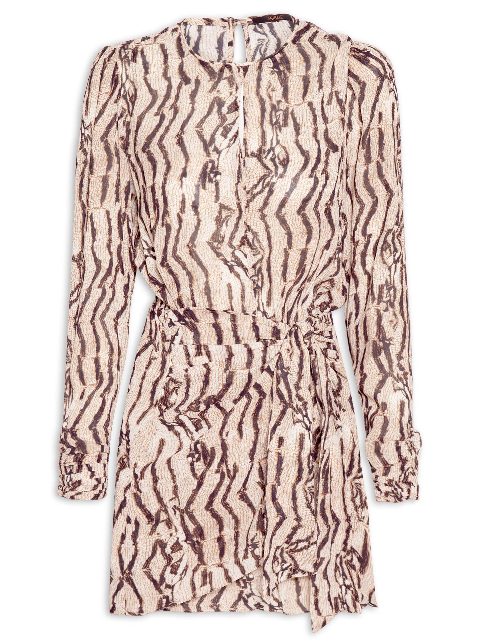 O vestido animal print é confeccionada em tecido leve sem elasticidade. A peça solta ao corpo possui decote redondo, mangas longas, recorte na altura da cintura com elástico embutido na parte posterior, recorte frontal vazado, faixas alongadas na parte frontal para amarração, comprimento curto, meio forro e fechamento posterior por botão.