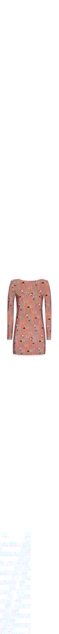 O vestido vermelho é confeccionado em malha com alta elasticidade. A peça justa ao corpo possui decote frontal canoa e posterior U profundo, mangas longas, estampa abstrata em cores contrastantes, forro e comprimento curto.