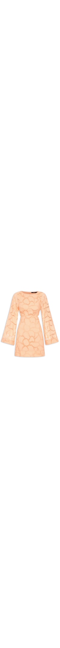 O vestido laranja é confeccionado em laise. A peça possui decote redondo, mangas longas modelo sino, recortes laterais vazados na altura da cintura estendidos para a parte posterior, aplicações de vivo de mesma cor nas costuras, forro, comprimento curto, shape solto e fechamento posterior porzíper invisível.