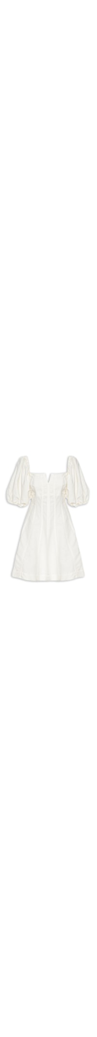 O vestido branco é confeccionado em tecido leve de algodão com toque de linho sem elasticidade. A peça justa ao corpo possui decote em V com aro embutito, sem bojo, mangas curtas bufantes com elástico aplicado aos ombros e punho, recortes frontais, posterior com lastex aplicado, leve franzido na parte posterior da cintura, comprimento curto, barra alongada, sem forro, sem fechamento.