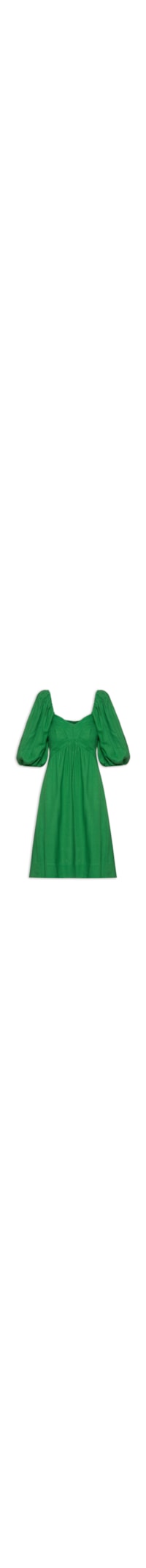O vestido verde é confeccionado em tecido leve com toque de linho sem elasticidade. A peça justa na altura do busto e solta no comprimento possui decote coração, mangas curtas bufantes com elástico embutido na altura dos ombros, recorte posterior em lastex, recortes na altura do busto e comprimento curto.