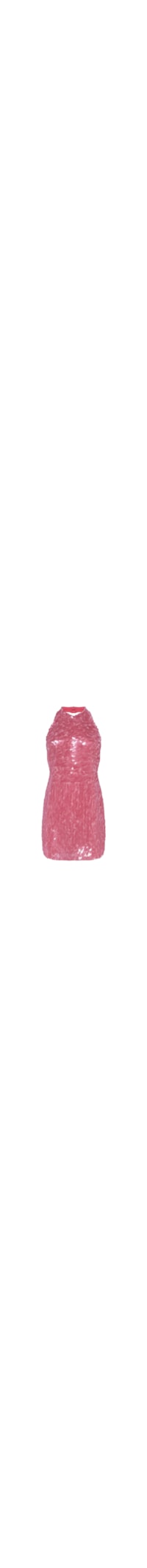 Vestido curto confeccionado em tule rebordado com paetês em formato de escamas de peixe, criando um efeito de brilho e textura únicos. Possui modelagem justa ao corpo e decote halter que valoriza os ombros com elegância. O fechamento é feito por dois botões forrados na gola das costas e zíper invisível lateral. Acabamento interno forrado em tule, garantindo conforto e um caimento impecável.