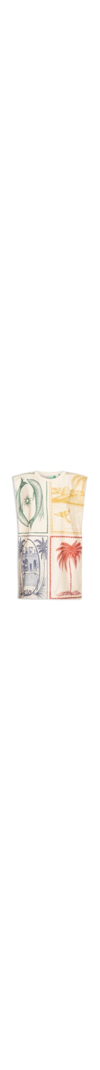 O vestido bege é confeccionado em malha de algodão sem elasticidade. A peça solta ao corpo possui decote redondo com acabamento canelado, alças com ombreiras embutidas, recorte frontal, mix de estampas em cores contrastantes e comprimento curto.