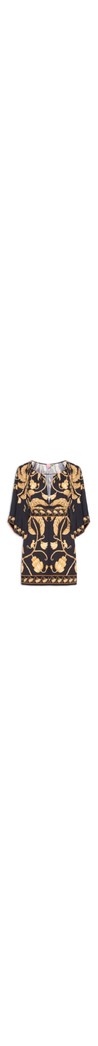 O vestido preto é confeccionado em tecido leve sem elasticidade. A peça solta ao corpo possui decote arredondado com recorte em V profundo, mangas 3/4 amplas, tira fina embutida na altura do decote frontal, efeito franzido na parte posterior, mix de estampas em cor contrastante e comprimento curto. Acompanha cinto de mesma padronagem e composição para uso opcional.