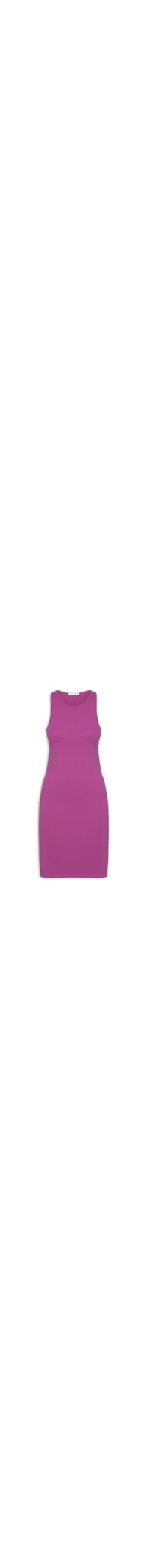 O vestido rosa é confeccionado em malha com alta elasticidade. A peça justa ao corpo possui decote redondo, alças médias, textura canelada, e comprimento curto.