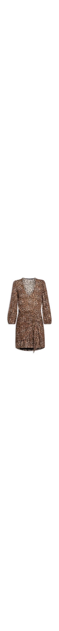 O vestido animal print é confeccionado em tecido leve com fios de lurex. A peça solta ao corpo possui decote V, mangas 7/8 com elástico embutido nos punhos, recorte na altura da cintura com detalhe de pregas, recorte frontal sobreposto com tiras alongadas para amarração, leve transparência, forro e comprimento curto.