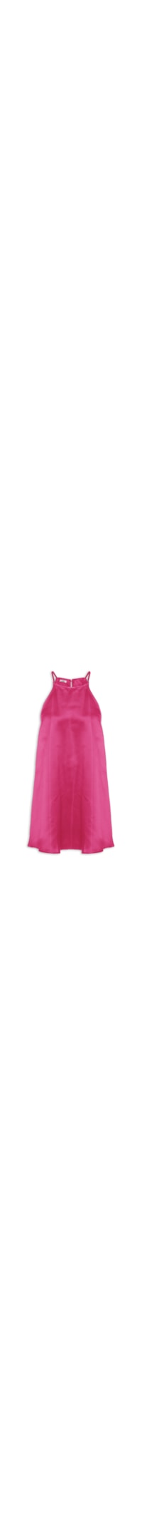 O vestido rosa é confeccionado em tecido leve. A peça possui decote trapézio com abotoamento posterior e recorte vazado, alças finas, comprimento curto, shape solto, caimento reto e acabamento pespontado.