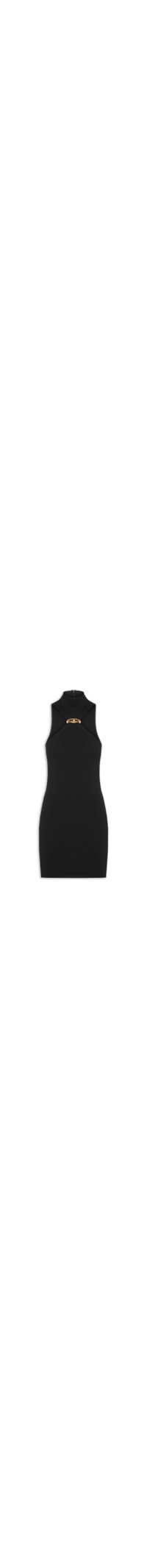 O vestido preto é confeccionado em malha canelada com média elasticidade. A peça justa ao corpo possui gola alta, aplicação de aviamento metalizado em formato arredondado no busto, cavas alongadas, fechamento posterior por zíper e comprimento curto.