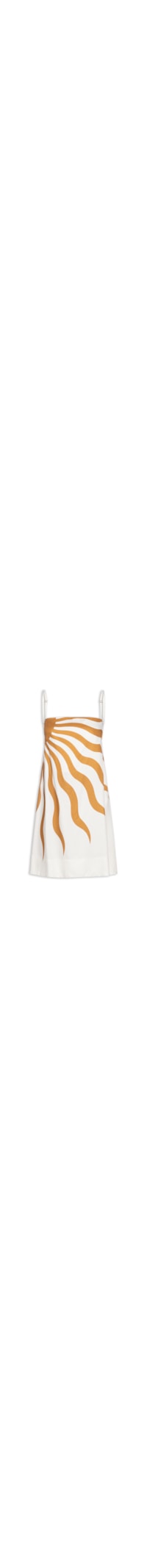O vestido branco é confeccionado em tecido leve sem elasticidade. A peça solta ao corpo possui decote reto, alças finas com regulagem na parte posterior, faixa alongada aplicada nas laterais para amarração posterior, elástico embutido na parte posterior, recorte vazado aplicado na parte posterior, pences frontais, estampa figurativa de sol na cor amarela e comprimento curto.