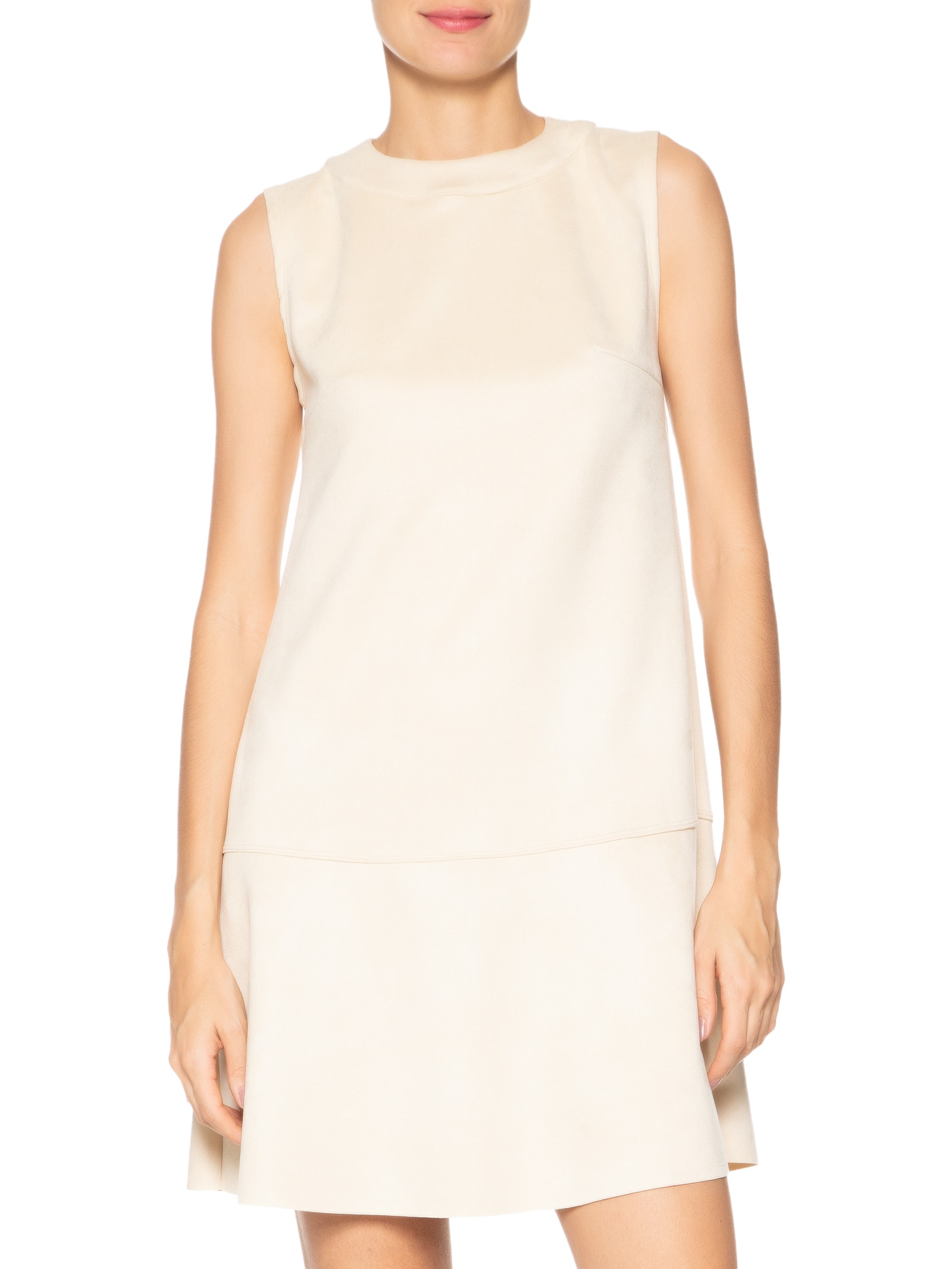 O vestido bege é confeccionado em suede com baixa elasticidade. A peça solta ao corpo possui decote redondo, alças largas, cavas regulares, recortes posteriores e frontais, detalhe vazado na parte posterior, comprimento curto e fechamento posterior por botões.
