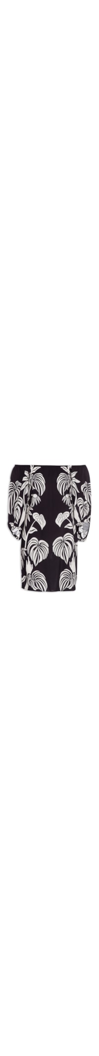O vestido preto é confeccionado em tecido leve sem elasticidade. A peça solta ao corpo possui decote ombro a ombro com elástico embutido, mangas 3/4 com detalhes de franzidos nos punhos, estampa floral em cor contrastante e comprimento curto.