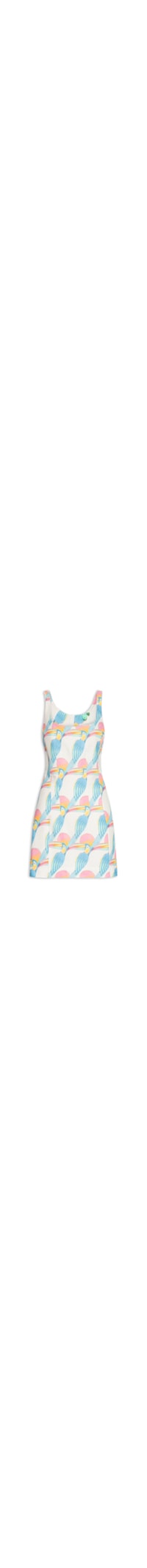 O vestido branco é confeccionado em tecido leve com toque de linho sem elasticidade.. A peça solta ao corpo possui decote reto, alças médias, cavas regulares, recortes frontais e posteriores, pences frontais e posteriores, estampa figurativa de tucanos em cores contrastates, comprimento curto e fechamento posterior por zíper.