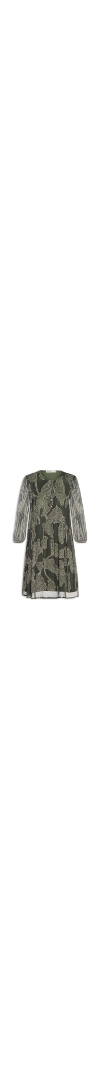O vestido verde é confeccionado em tecido leve com baixa elasticidade. A peça solta ao corpo possui decote arredondado com tiras para amarração, mangas 3/4 com elástico no punho, mix de estampa em cores contrastantes, forro e comprimento curto.