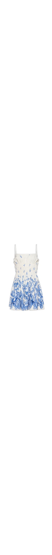 O vestido azul é confeccionada em linho misto sem elasticidade. A peça justa no busto e solta ao corpo possui decote reto, alças finas com regulagem, recortes posteriores e frontais com elástico embutido e franzidos, sem bojo, estampa floral e comprimento curto.