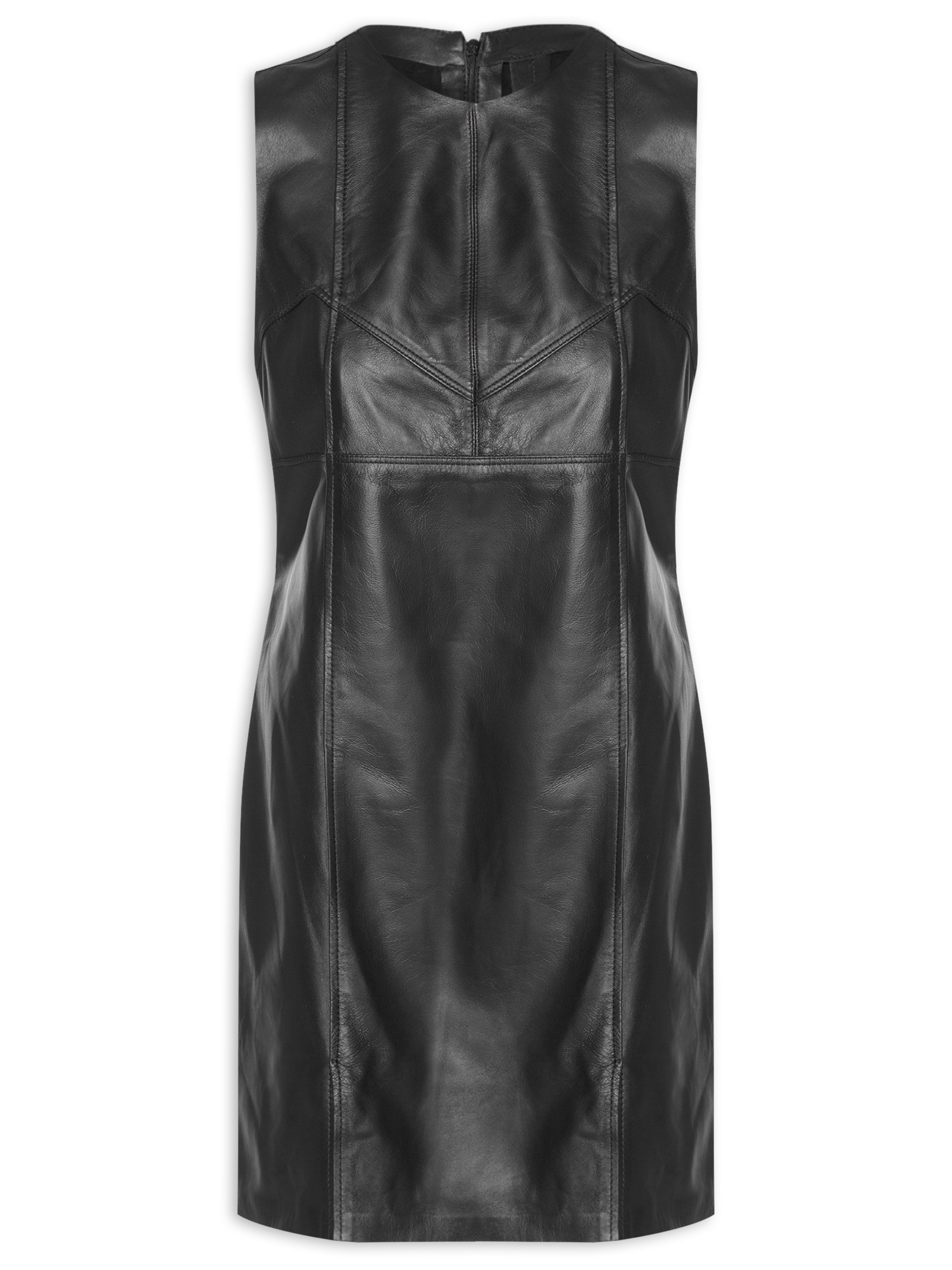 O vestido preto é confeccionado em couro. A peça solta ao corpo possui decote redondo, alças médias, cavas estendidas, recortes frontais e posteriores, recortes frontais com fendas, comprimento curto e fechamento posterior por zíper.