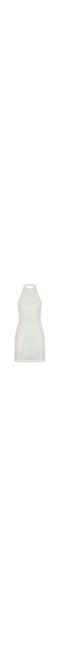 O vestido bege é confeccionado em tule com superfície em paetê e sem elasticidade. A peça de modelo frente única justa na altura do busto e da cintura e solta no comprimento possui decote trapézio, alças finas com elástico embutido e fechamento posterior por botão, tiras médias na parte posterior com elástico embutido, recortes posteriores vazados, pences frontais, forro, comprimento curto e fechamento posterior por zíper invisível.