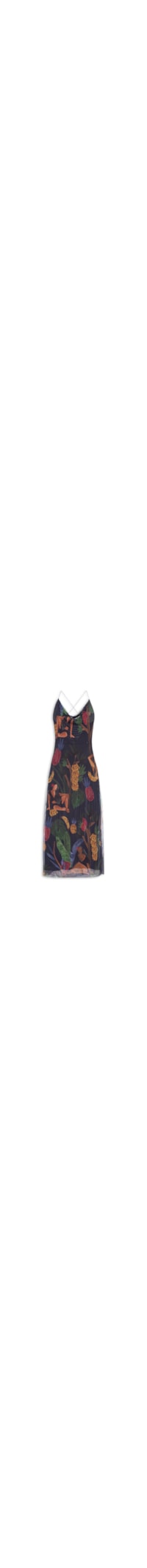 O vestido azul é confeccionado em tule com alta elasticidade. A peça possui decote frontal e posterior degagê, alças finas cruzadas na parte posterior, comprimento midi.