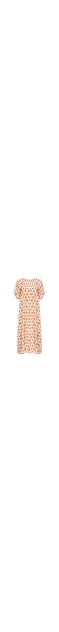 O vestido bege é confeccionado em tecido leve com toque de linho sem elasticidade. A peça solta ao corpo, possui decote canoa, mangas 3/4 com ombros franzidos, recorte franzido na parte inferior do busto, estampa de flores em cores contrastantes e comprimento midi.