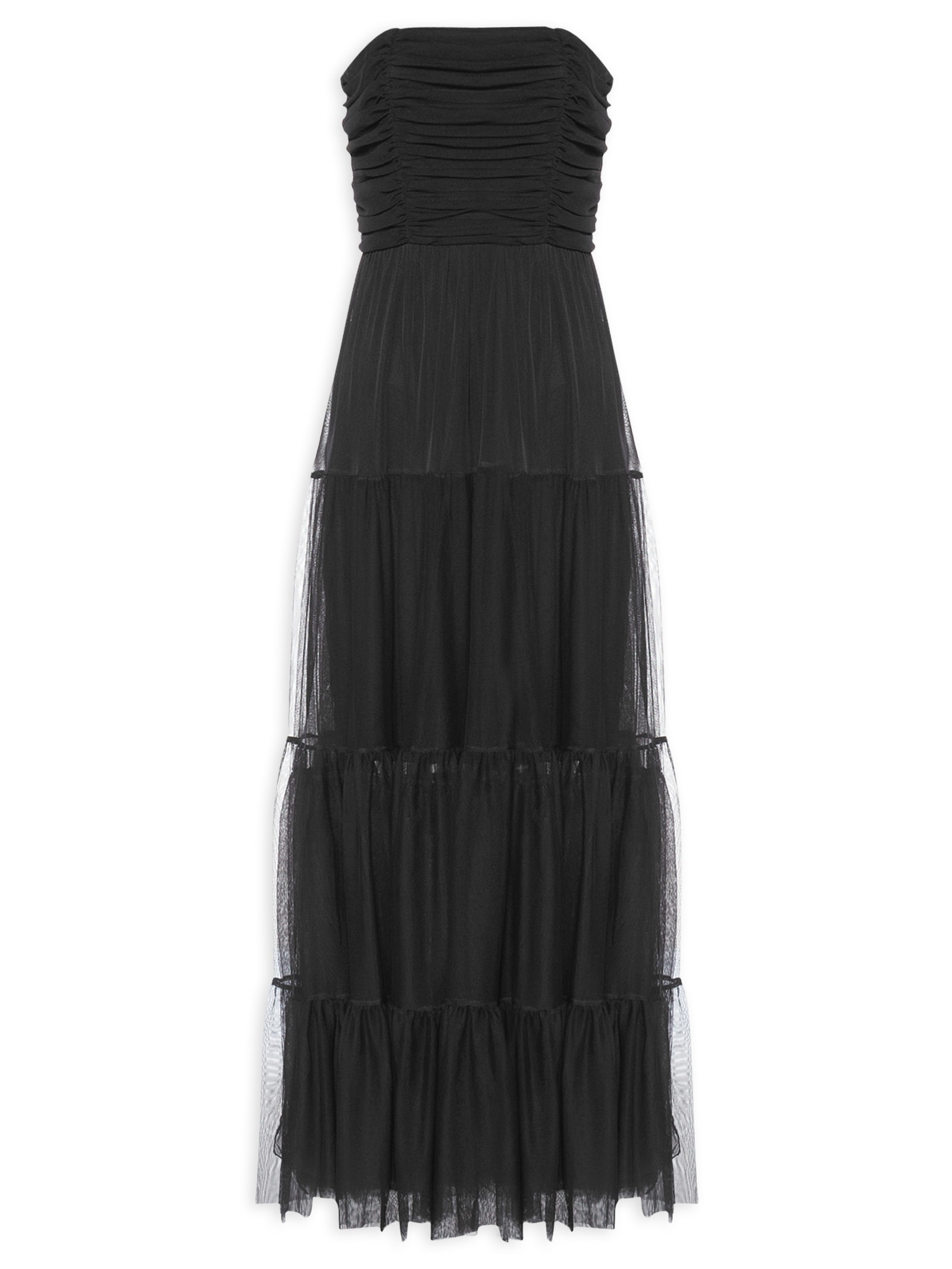 O vestido preto é confeccionado em tule sem elasticidade. A peça justa ao busto e solta no comprimento de modelo tomara que caia possui decote reto, recortes na altura do busto com pregas recortes na saia com efeito franzido e leve transparência,  forro médio, comprimento longo e fechamento posterior por zíper invisível.