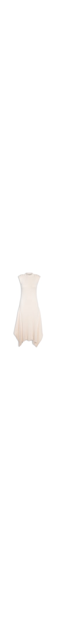 O vestido bege é confeccionado em tricot com superfície canelada e alta elasticidade. A peça solta ao corpo possui gola alta, ombreiras embutidas, barra assimétrica e comprimento midi.