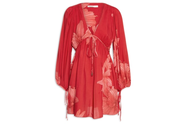 O vestido vermelho é confeccionado em tecido leve sem elasticidade. A peça solta ao corpo possui decote V transpassado com fechamento por botão de pressão, mangas longas bufantes, estampa paisley em cores contrastantes, recorte na altura da cintura com elástico embutido e franzidos, barra arredondada e comprimento midi.