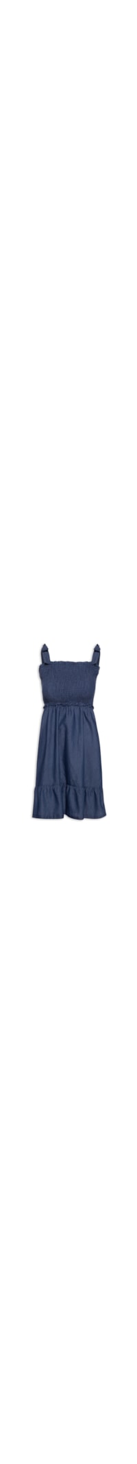 O vestido azul é confeccionado em tecido leve com lavagem jeans sem elasticidade. A peça justa ao busto e solta no comprimento possui decote reto, alças médias em tiras alongadas para amarração, parte superior com lastex aplicado, detalhe de babados, recorte com pregas próximo a barra e comprimento curto.