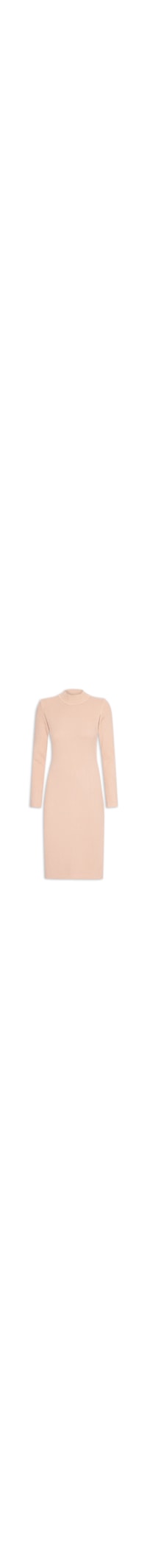 O vestido bege é confeccionado em tricot com superfície canelada e alta elasticidade. A peça justa ao corpo possui gola alta, mangas longas e comprimento curto.